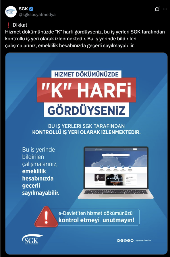 SGK, hizmet dökümünde “K” harfi bulunan sigortalıları uyardı.